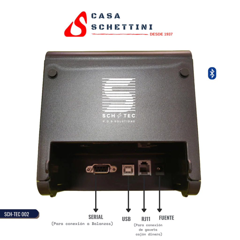 - Conexiónes: USB - SERIAL (para balanza. Incluye Cable) - CAJON DE DINERO - BLUETOOTH (la conexión BT no funciona con balanzas, pero le será útil en caso de necesitar imprimir desde una PC, Tablet, Celular u otros dispositivos móviles)