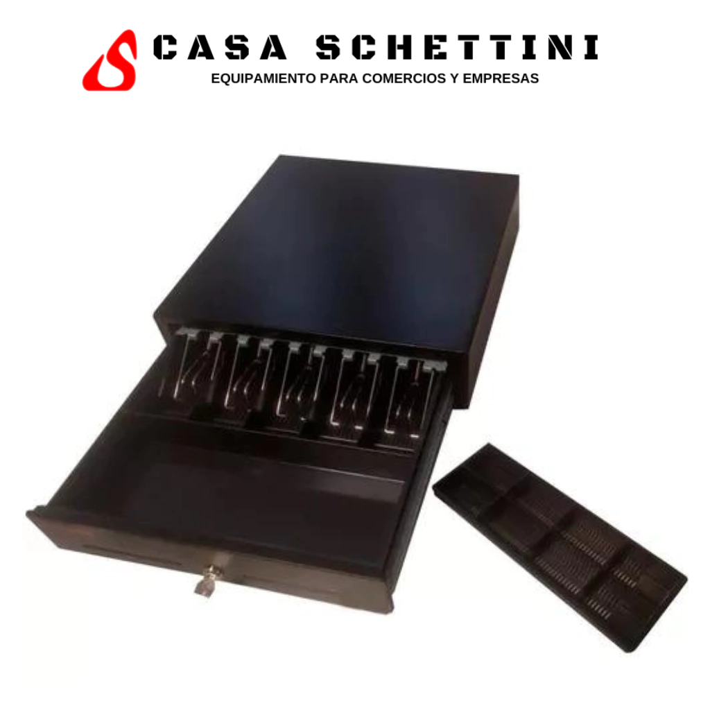 Especificaciones técnicas: Cajón de acero sólido. Marco frontal plástico portamonedas de plástico con diseño de líneas curvas. Monedero plástico ABS removible con insertos para 5 billetes y 8 compartimentos extras. Correderas con rodamientos a bolilla. Dos ranuras pasa cheques. Barra de bloqueo de barra. Llave de 3 posición. Agujero de anclaje en la parte superior de la cubierta del cajón de dinero. Recubrimiento de polvo internos. Solenoide 24V 1A y conector RJ11 (estándar) c/Micro-switch sensor de apertura.