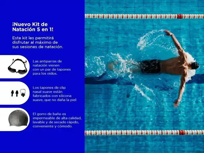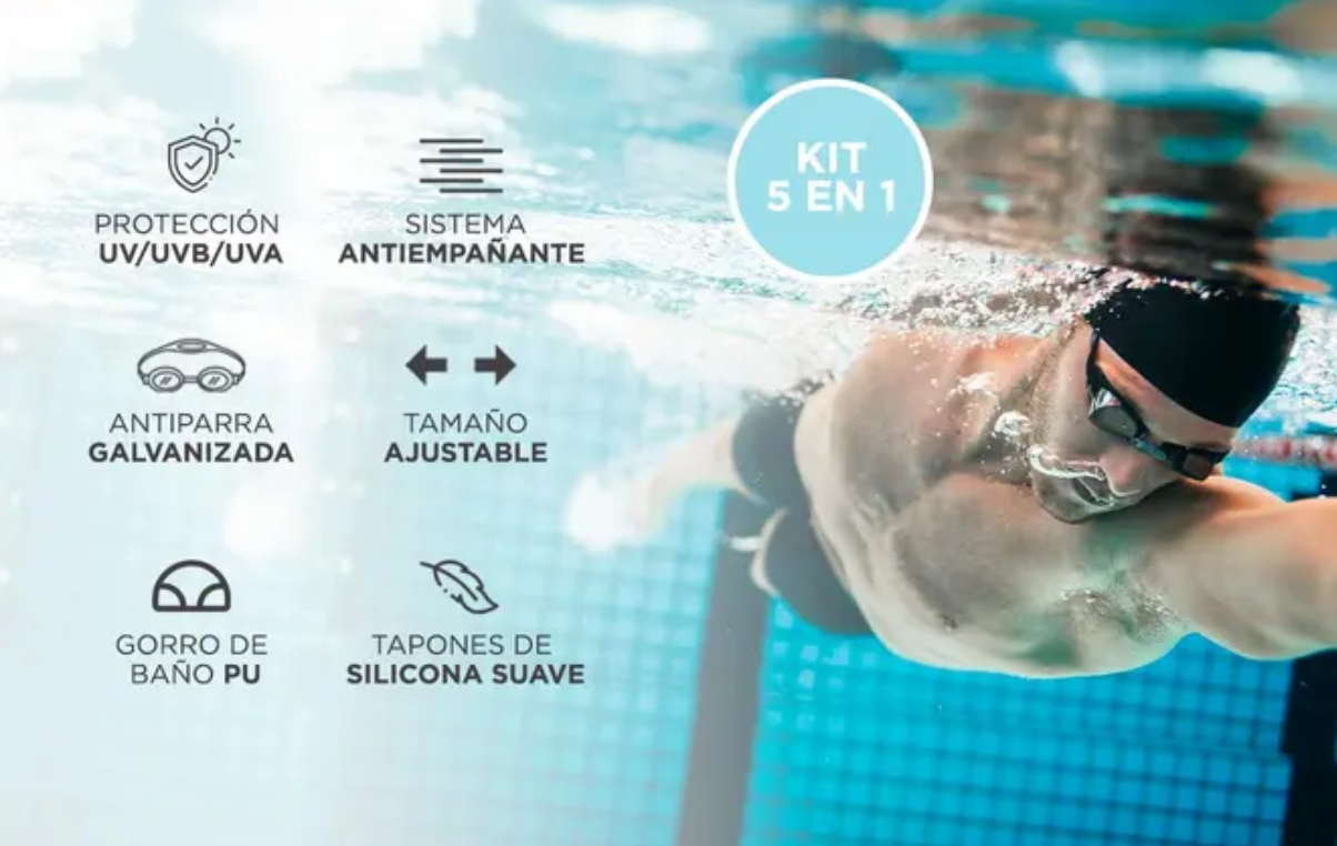 Este kit les permitirá disfrutar al máximo de sus sesiones de natación. Las antiparras de natación vienen con un par de tapones para los oídos y además, un par de tapones para los oídos separados. Este kit también incluye un gorro de baño impermeable de alta calidad, lavable y de secado rápido, conveniente y cómodo.