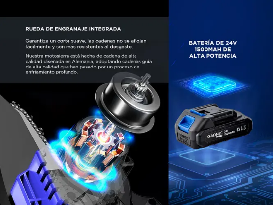 La mini motosierra Gadnic MS2400 está equipada con un motor de cobre puro y 2 baterías de 24 V 1500mAh de alta potencia.
