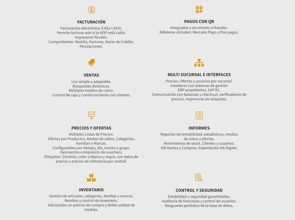 *Búsquedas especiales o por criterios - Venta y devolución de envases - Recargos y descuentos al subtotal - Recargos y descuentos al ítem - Funcionalidad de ticket en espera.
