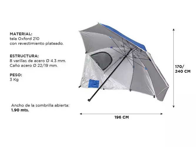 Está fabricada con tela Oxford 210 de alta resistencia, con tratamiento rompe viento para mayor estabilidad incluso en días ventosos. Su estructura espaciosa es perfecta para 2 a 3 personas, ofreciendo refugio cómodo y confiable bajo el sol.