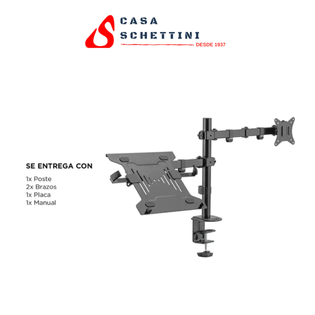 El soporte incorpora una placa VESA desmontable para una fácil instalación y clips para cables que mantendrán tu lugar de trabajo organizado y libre de desorden. Su acabado en negro mate le da un aspecto elegante y profesional.