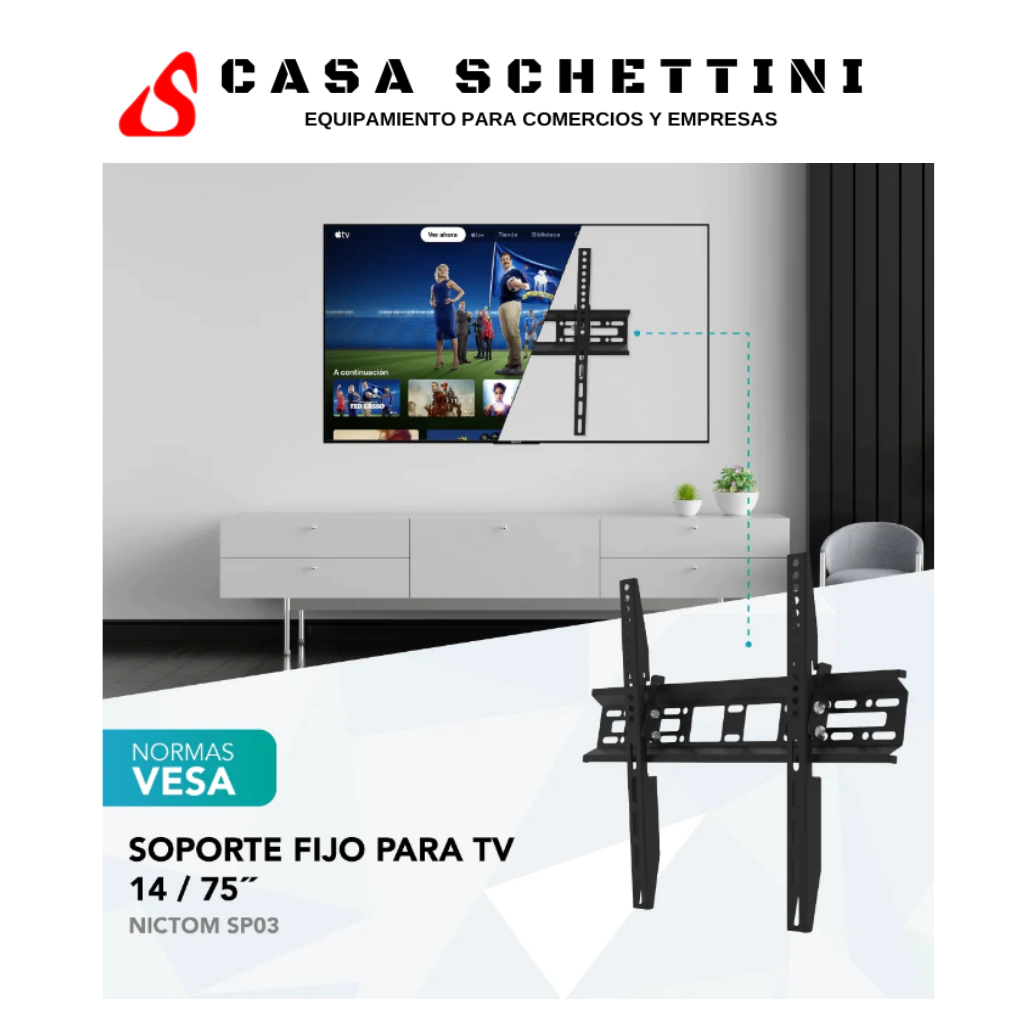Es fuerte, resistente y de fácil instalación. Es un soporte fijo, apto para pantallas de 14” a 75” y soporta un peso máximo de 40 kg.